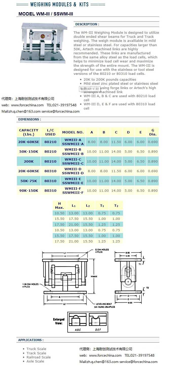 WM-III称重模块测力传感器旨在利用双头剪力梁进行卡车和轨道称重。称重模块可在低碳钢或不锈钢。容量大于50K, Artech加工链接强烈推荐。这些链接由与测压元件相同的合金钢制造,这有助于最大限度地减少测压元件的磨损,并最大限度地提高整个安装的强度。WM-III设计用于不锈钢或工具钢版本的80210或80310测压元件。