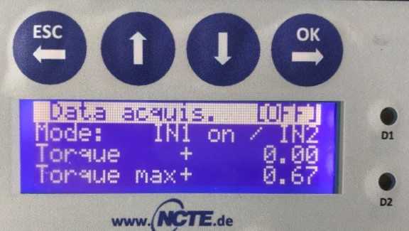 在产品进入测试之前,给IN1一个高电平3~24Vdc 的ON 信号触发测试开始;进入扭矩测试,这里完成测试之后仪表会显示一个峰值,显示时间为Trigger period设置的时间;