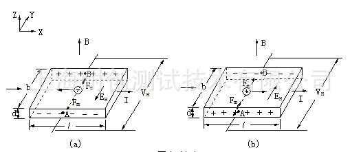 将一块半导体或导体材料,沿Z方向加以磁场B,沿X方向通以工作电流I,则在Y方向产生出电动势VH,如图1所示,这现象称为霍尔效应。VH称为霍尔电压。