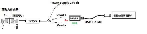 传感器(原始mV信号)—放大器(标准模拟量)—数据采集卡(通过USB)—电脑界面软件(基于NI LabView编程)。