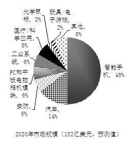 说明:气泡大小代表到2022年市场规模 资料来源:麦姆斯咨询(MEMS Consulting). 据麦姆斯咨询(MEMS Consulting)数据,2016年全球MEMS传感器市场规模约114亿美元,到2021年市场规模将达到220亿美元,年均复合增长率为14%。其中,射频MEMS、振荡器、微流控和气体传感器成为MEMS增长驱动力(图4)。 当前全球前十名MEMS厂商是博世、意法半导体、惠普、德州仪器、应美盛、安华高、Qorvo、楼氏电子、佳能和松下。博世因为其在汽车电子和消费电子的双重布局,牢牢占据着第一的位置。目前,大部分MEMS行业的主要厂商是以Fabless(只做设计,没有生产)为主,例如楼氏、惠普、佳能等。同时,也有IDM(Integrated Device Manufacture,集成器件制造模式,从设计,到制造、封装测试以及投向消费市场一条龙全包的企业,称为IDM公司)厂商垂直参与到整条产业链的各个环节,比如博世、意法半导体等都建有自己的晶元代工生产线。 MEMS传感器趋向微型化、材料多样化、无源化方向发展。受益于物联网产业的快速发展,将对MEMS行业带来巨大的发展红利。除了智能手机,MEMS传感器将在 AR/VR、可穿戴等消费电子,智能驾驶、智能工厂、智慧物流、 智能家居、环境监测、智慧医疗等物联网领域广泛应用。 2.CMOS图像传感器CMOS(Complementary Metal Oxide Semiconductor,互补金属氧化物场效应管)图像传感器芯片采用CMOS工艺,将图像采集单元和信号处理单元集成到同一块芯片上,适合大规模批量生产,适用于要求小尺寸、低价格、摄像质量无过高要求的应用,如保安用小型和微型相机、手机、计算机网络视频会议系统、无线手持式视频会议系统、条形码扫描器、传真机、玩具、生物显微计数、某些车用摄像系统等大量商用领域。20世纪80年代,英国爱丁堡大学成功制造出世界上第一块单片CMOS图像传感器件。目前,CMOS图像传感器正在得到广泛的应用,具有很强的市场竞争力和广阔的发展前景。 据市场研究调查机构IC Insights的数据,2015年全球CMOS图像传感器市场规模增长12%,达到99亿美元,而2015年也是连续5年年度销售创新高。IC Insight预测2015年至2020年期间,CMOS图像传感器市场将以9.0%的年均复合增长率逐年增长,到2020年市场规模将达到152亿美元。 IC Insights表示,过去的增长主要基于智能手机和数码相机对CMOS图像传感器的采用,但现在及以后的增长则主要扩大到汽车、安全和医疗应用。汽车以后很可能会需要几个甚至更多的图像传感器用于观察行人,注意外面可能发生的事故或录制撞车等其他事故的视频。预计汽车系统将成为CMOS图像传感器增长最快的应用,未来5年全球销售将以55%的年均复合增长率发展,到2020年市场规模达22亿美元(占2020年CMOS图像传感器市场规模的14%)。紧随汽车之后的是安防(以36%的年均复合增长率增长到9.12亿美元)、医疗/科学应用(以34%的年均复合增长率增长到8.67亿美元)、玩具/电子游戏(以32%的年均复合增长率增长到2.74亿美元)和工业系统(以18%的年均复合增长率增长到8.97亿美元)。同时,CMOS图像传感器领先应用的智能手机预计将以1%的年均复合增长率到2020年达到73亿美元(市场占比为48%)。用于PC和平板电脑的相机模块中的CMOS图像传感器预计会以6%的年均复合增长率发展到2020年的9.73亿美元,而用于独立数码相机的传感器销售预计在未来5年达到6.23亿美元(图5)。