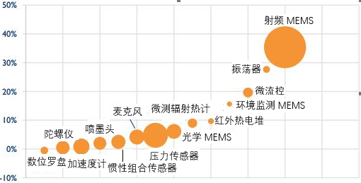 图4 2017—2022年不同MEMS器件的复合年均增长率及市场规模(单位:亿美元)