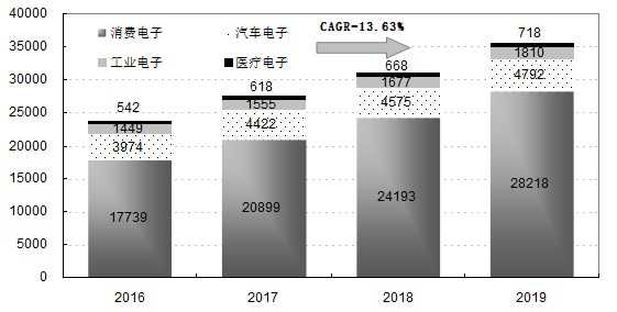 图1 2016-2019年全球四大应用领域的智能传感器市场规模(百万美元) 资料来源:中国信通院
